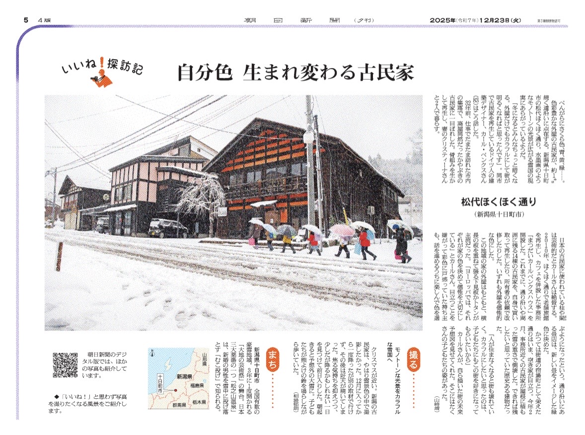2025年12月23日(火)朝日新聞(夕刊)いいね!探訪記に「自分色 生まれ変わる古民家」と題して松代ほくほく通りでの取り組みが掲載されました。