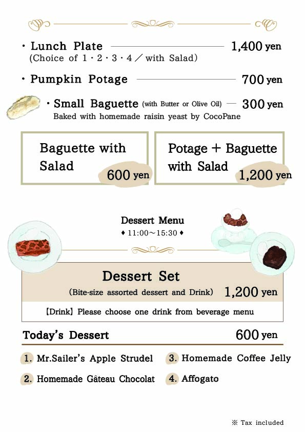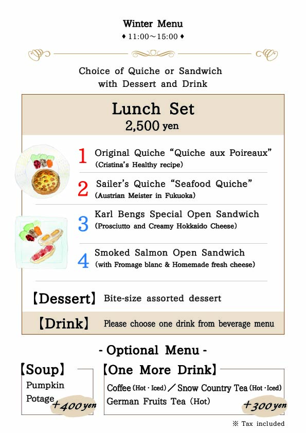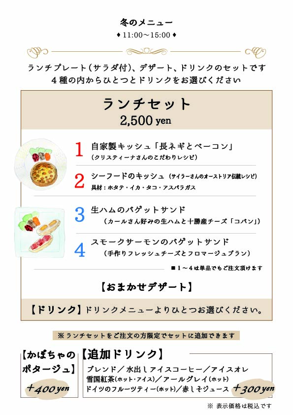 カールベンクス古民家カフェ『澁い -SHIBUI-』 木金土日・祝日営業 時間 11:00~16:00(ランチLO15:00/ドリンクLO15:30) ご予約 025-594-7944 *受付時間10:00〜16:00(木〜日曜・祝) 冬のメニュー ドリンクメニュー English Menu SHIBUI