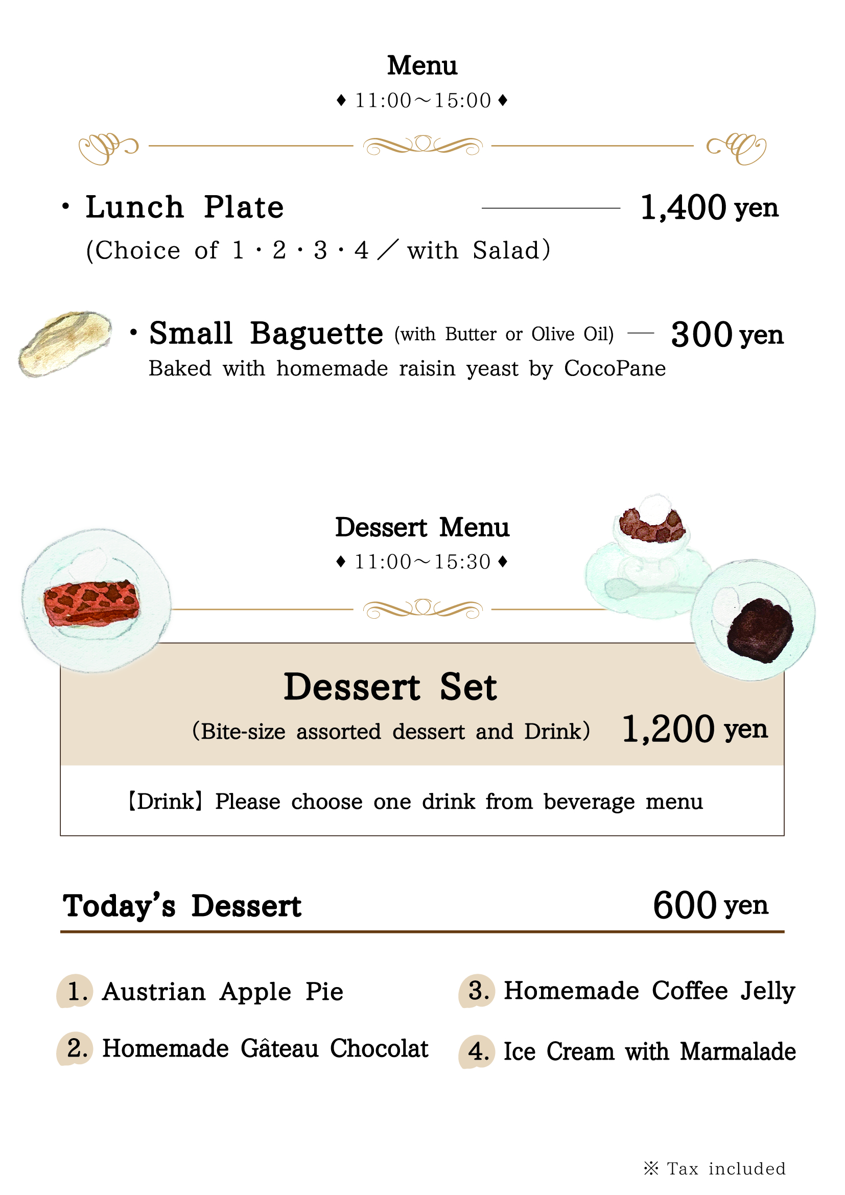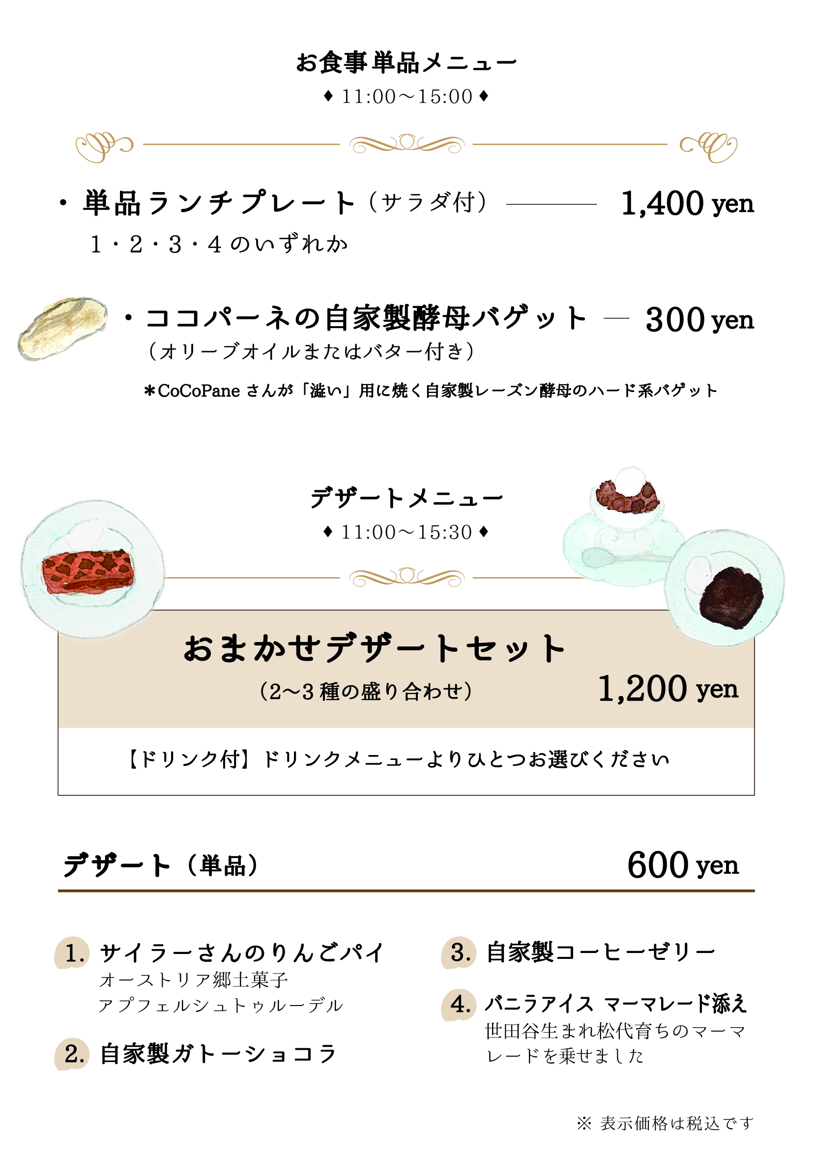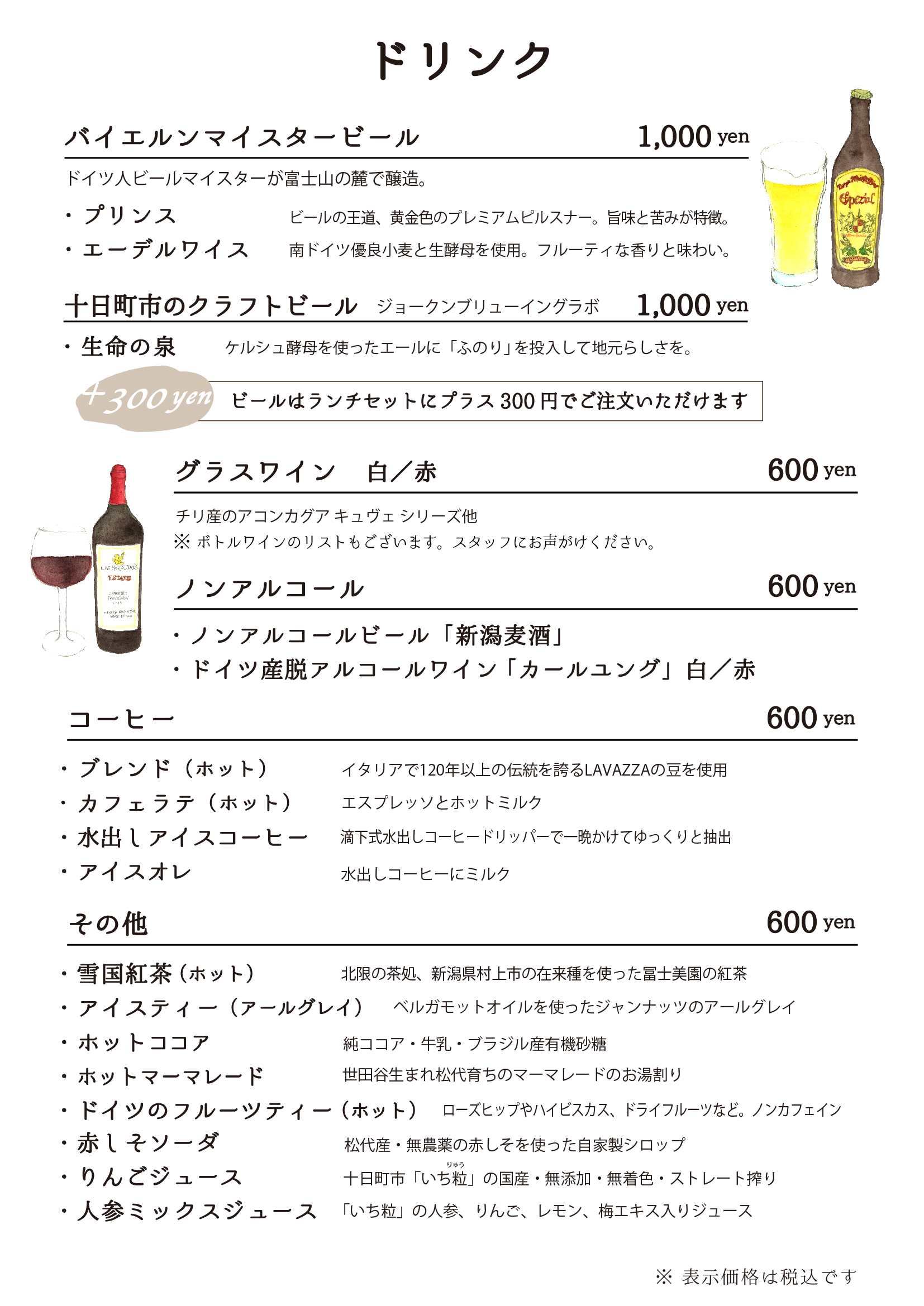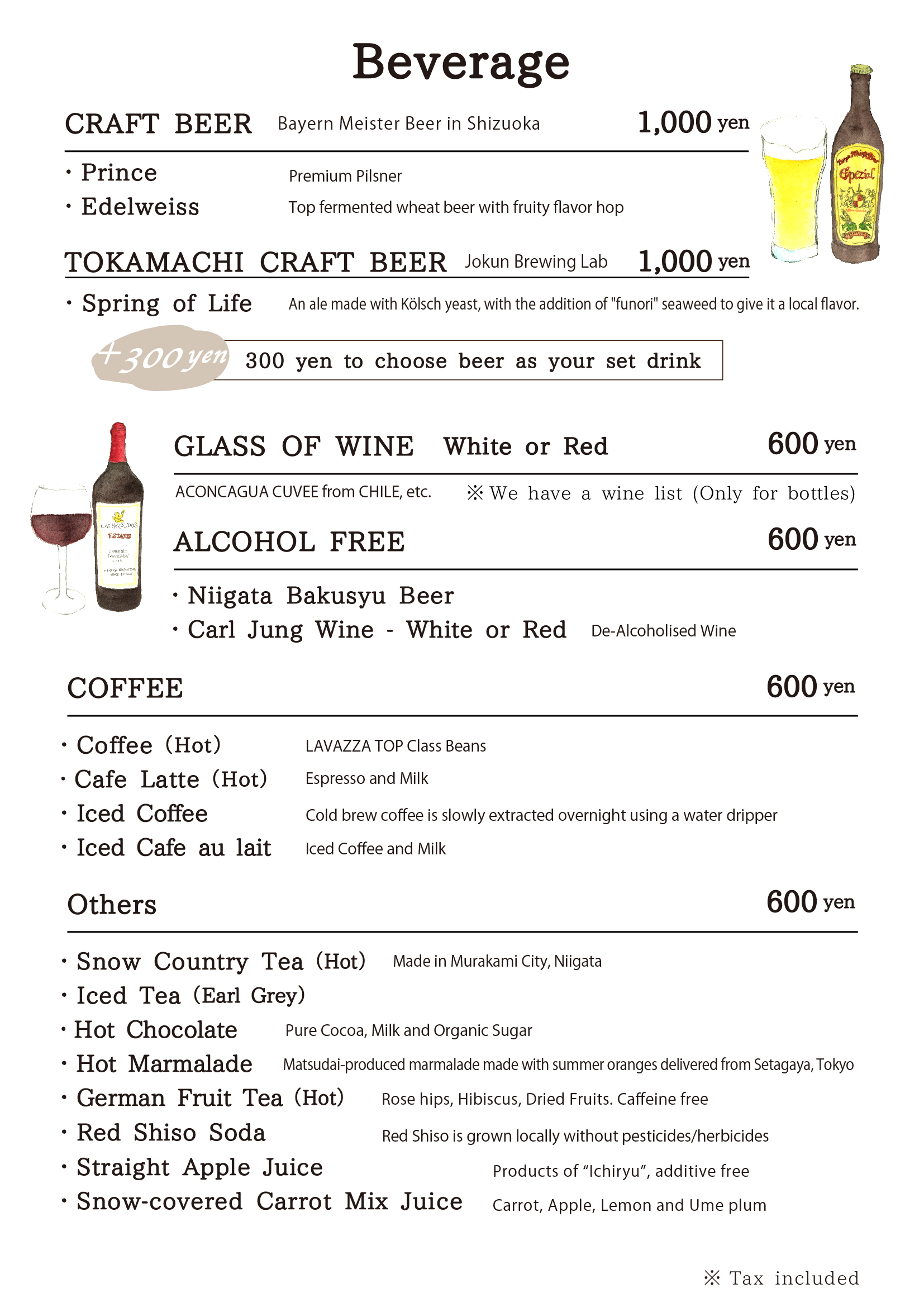 2026年4月23日より「春からのメニュー」になりました。カールベンクス古民家カフェ『澁い -SHIBUI-』 木金土日・祝日営業 時間 11:00~16:00(ランチLO15:00/ドリンクLO15:30) ご予約 025-594-7944 *受付時間10:00〜16:00(木〜日曜・祝) 2026春からのメニュー ドリンクメニュー English Menu SHIBUI